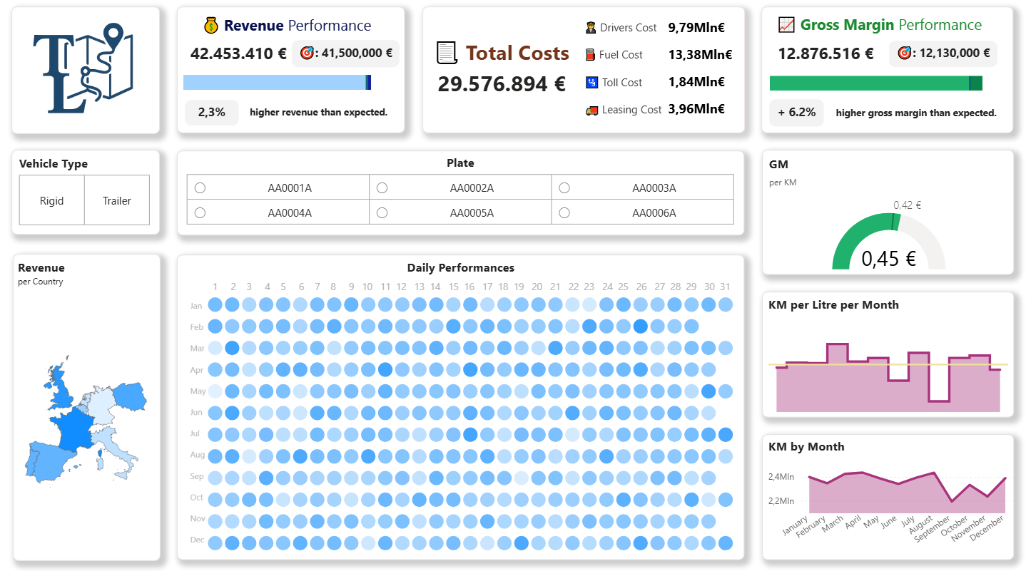 You see every day’s revenue, kilometers, and margin trend.