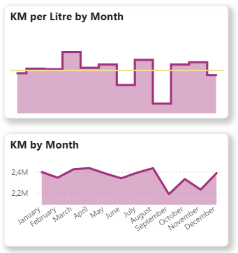 Kilometers per Litre by Month, Kilometers driven by Month (and much more possible: Total kilometers driven, cost per kilometer, margin per kilometer, etc.).